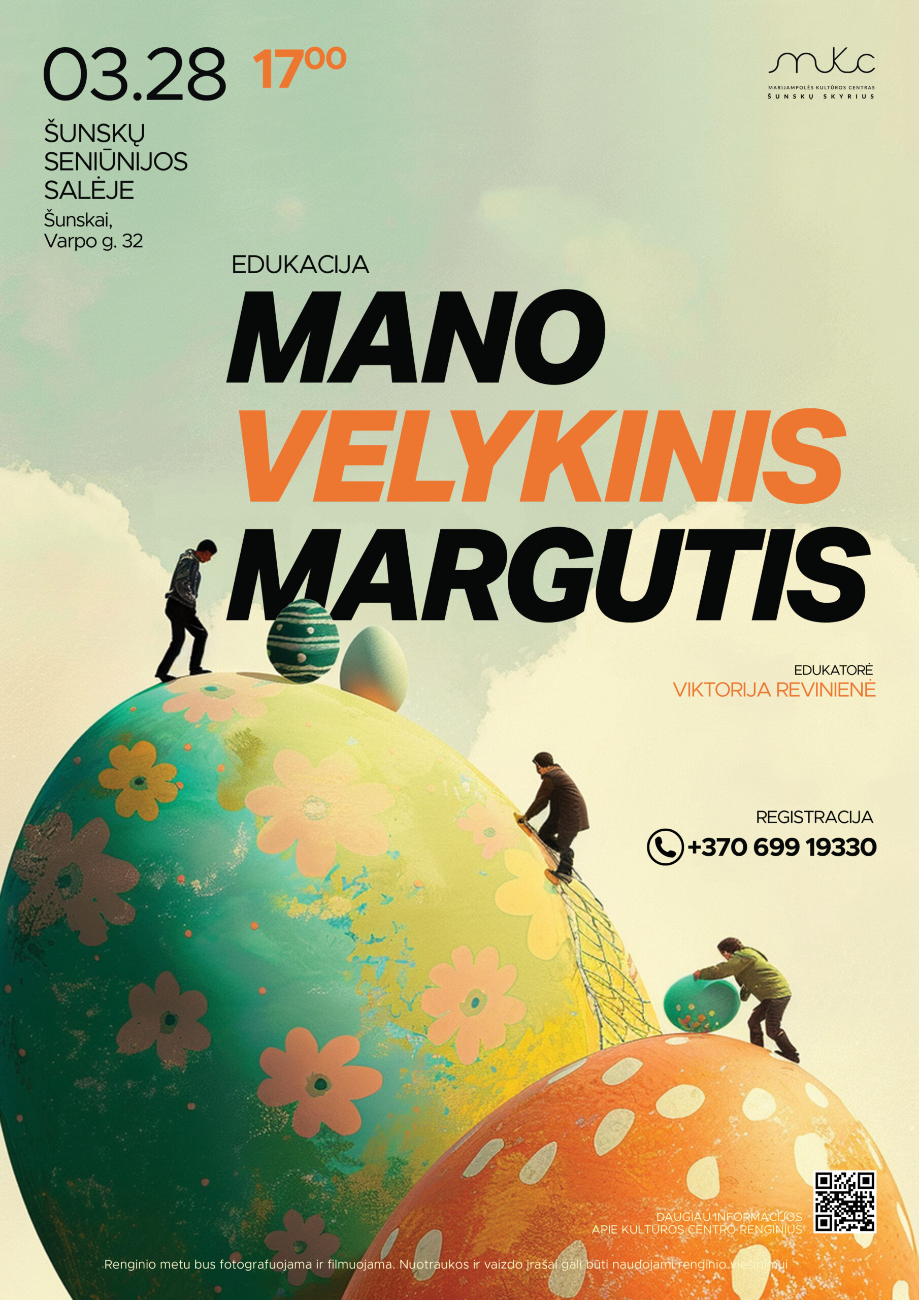 Pagrindinis Renginiai - Marijampolės kultūros centras Edukavimas Edukacija „Mano velykinis margutis” su edukatore V. Reviniene | Šunskai Edukacija „Mano velykinis margutis” su edukatore V. Reviniene | Šunskai Renginys nemokamas. Būtina išankstinė registracija nurodyrtais kontaktais. Data Kov 28 2024 Įvykęs! Laikas 17:00 - 17:00 Kategorijos Edukavimas Dalintis