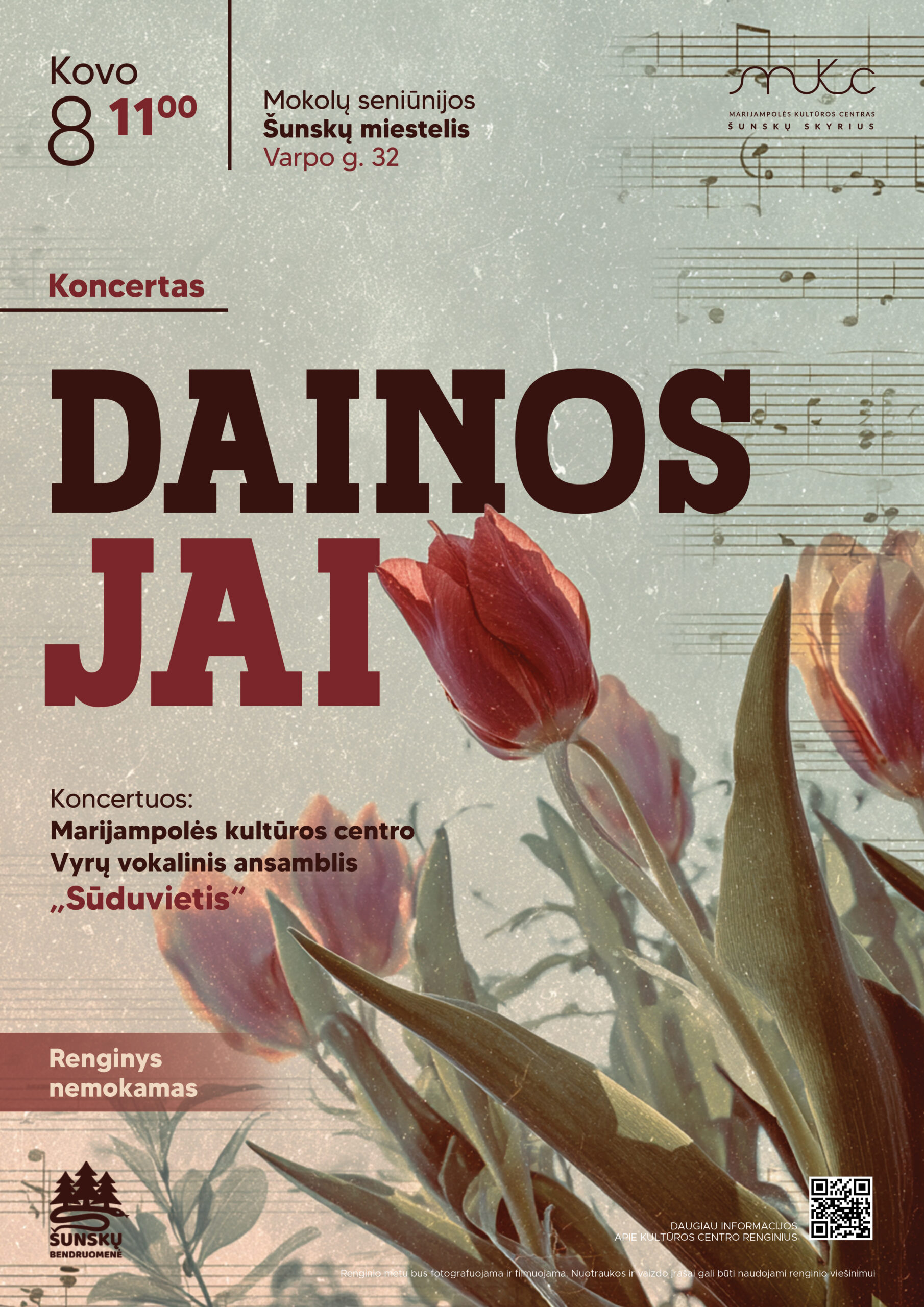 Kovo 8 d. 11 val. kviečiame į koncertą „Dainos jai“ Šunskų miestelyje (Mokolų seniūnija).