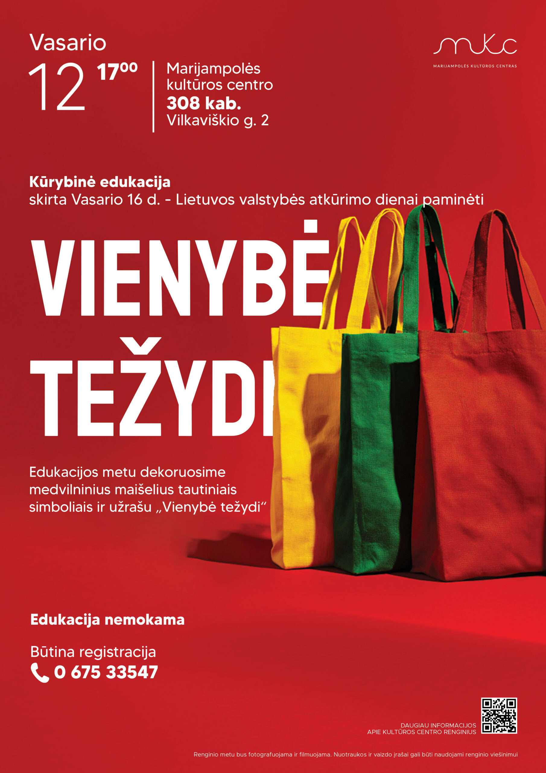 Artėjant Vasario 16-ajai kviečiame susitikti kūrybiškai – edukacijos metu dekoruosime medvilninius maišelius tautiniais simboliais ir užrašu „Vienybė težydi“. Paprasta, prasminga ir praktiška – pasigaminsite daiktą, kuris primins apie tai, kas mus jungia.