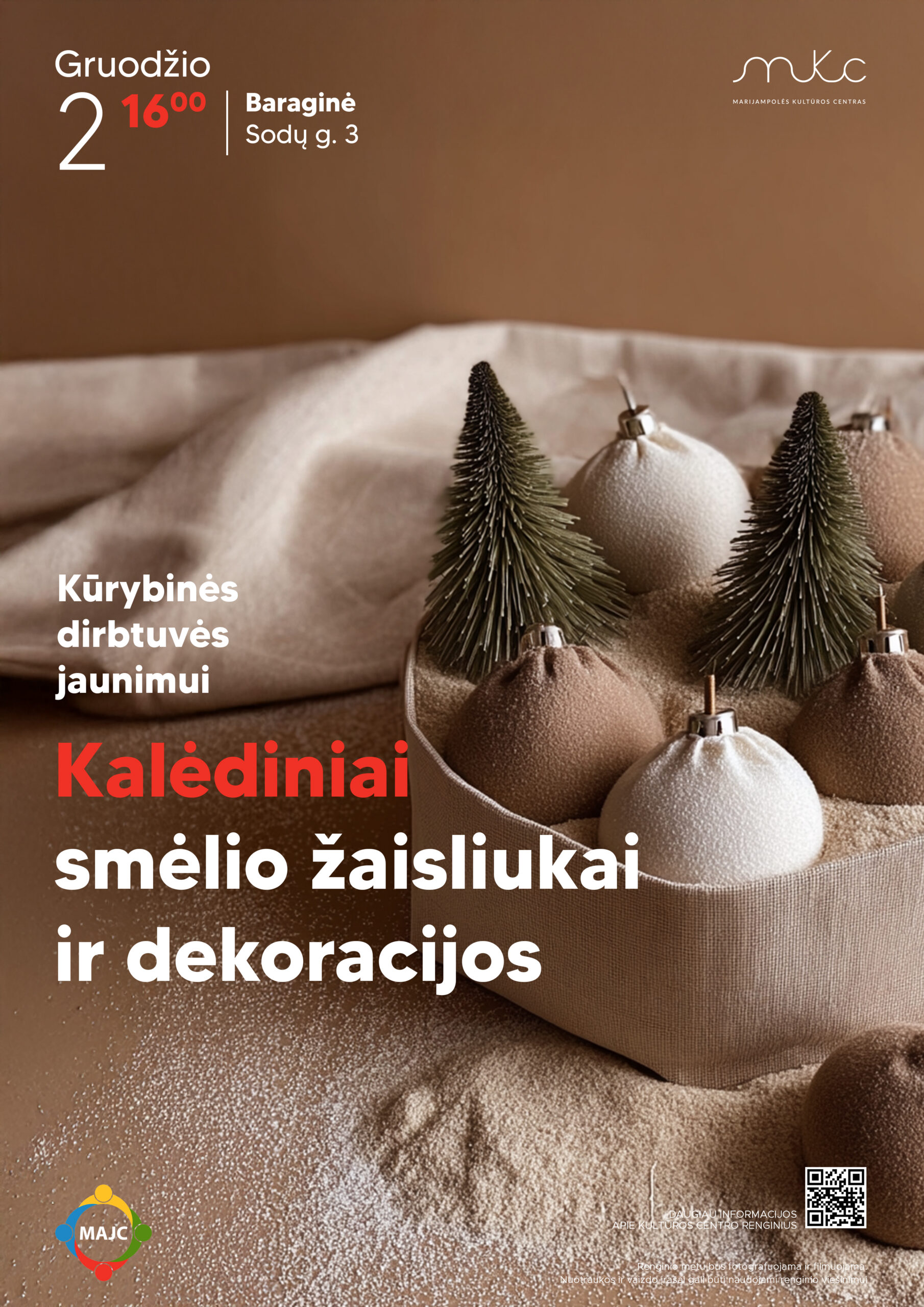 Pagrindinis Renginiai - Marijampolės kultūros centras Edukavimas Kūrybinės dirbtuvės jaunimui „Kalėdiniai smėlio žaisliukai ir dekoracijos” | Baraginė Kūrybinės dirbtuvės jaunimui „Kalėdiniai smėlio žaisliukai ir dekoracijos” | Baraginė Renginys nemokamas Data Gru 02 2025 Įvykęs! Laikas 16:00 - 16:00 Kategorijos Edukavimas Dalintis