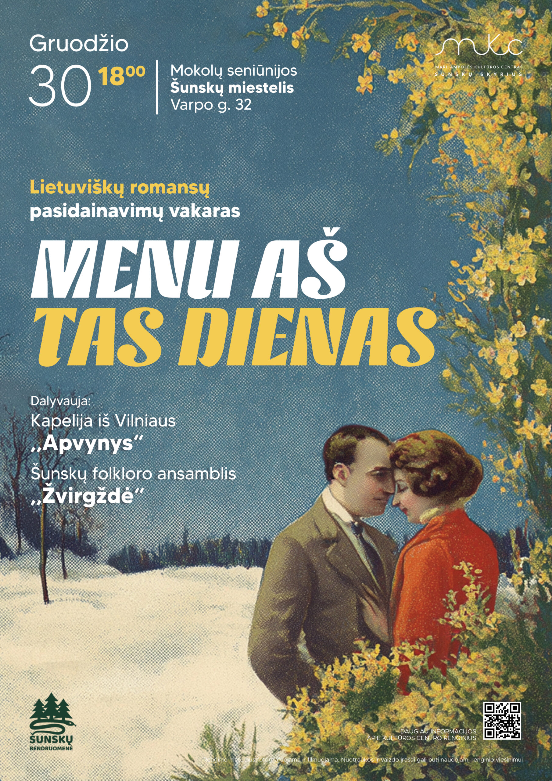 Pagrindinis Renginiai - Marijampolės kultūros centras Muzika Lietuviškų romansų pasidainavimų vakaras „Menu aš tas dienas” | Šunskai Lietuviškų romansų pasidainavimų vakaras „Menu aš tas dienas” | Šunskai Renginys nemokamas Data Gru 30 2025 Įvykęs! Laikas 18:00 - 18:00 Kategorijos Muzika Dalintis