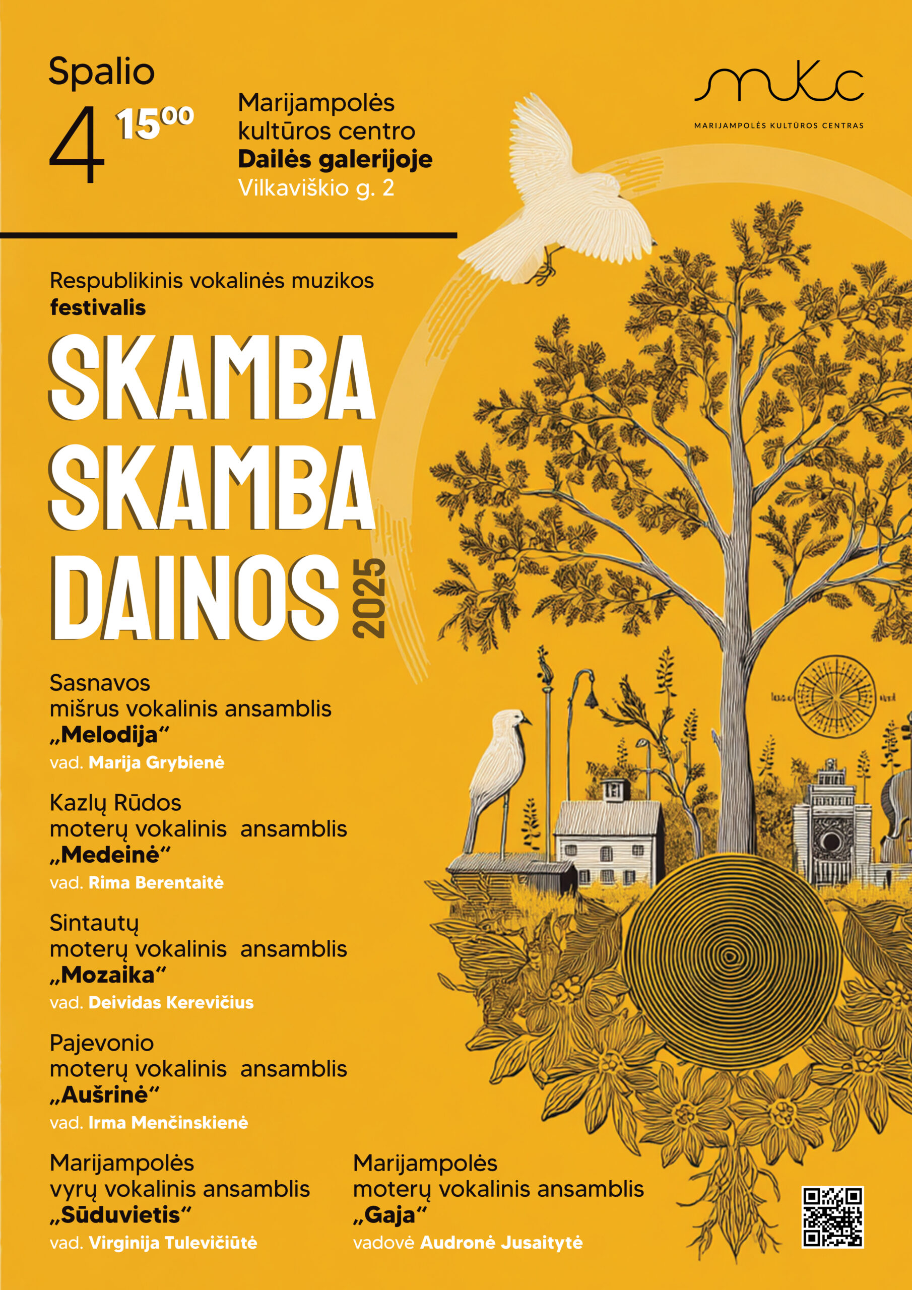 Pagrindinis Renginiai - Marijampolės kultūros centras Muzika Respublikinis vokalinės muzikos festivalis „SKAMBA SKAMBA DAINOS 2025″ | Dailės galerija Respublikinis vokalinės muzikos festivalis „SKAMBA SKAMBA DAINOS 2025″ | Dailės galerija Renginys nemokamas Data Spa 04 2025 Įvykęs! Laikas 15:00 - 15:00 Kategorijos Muzika Dalintis