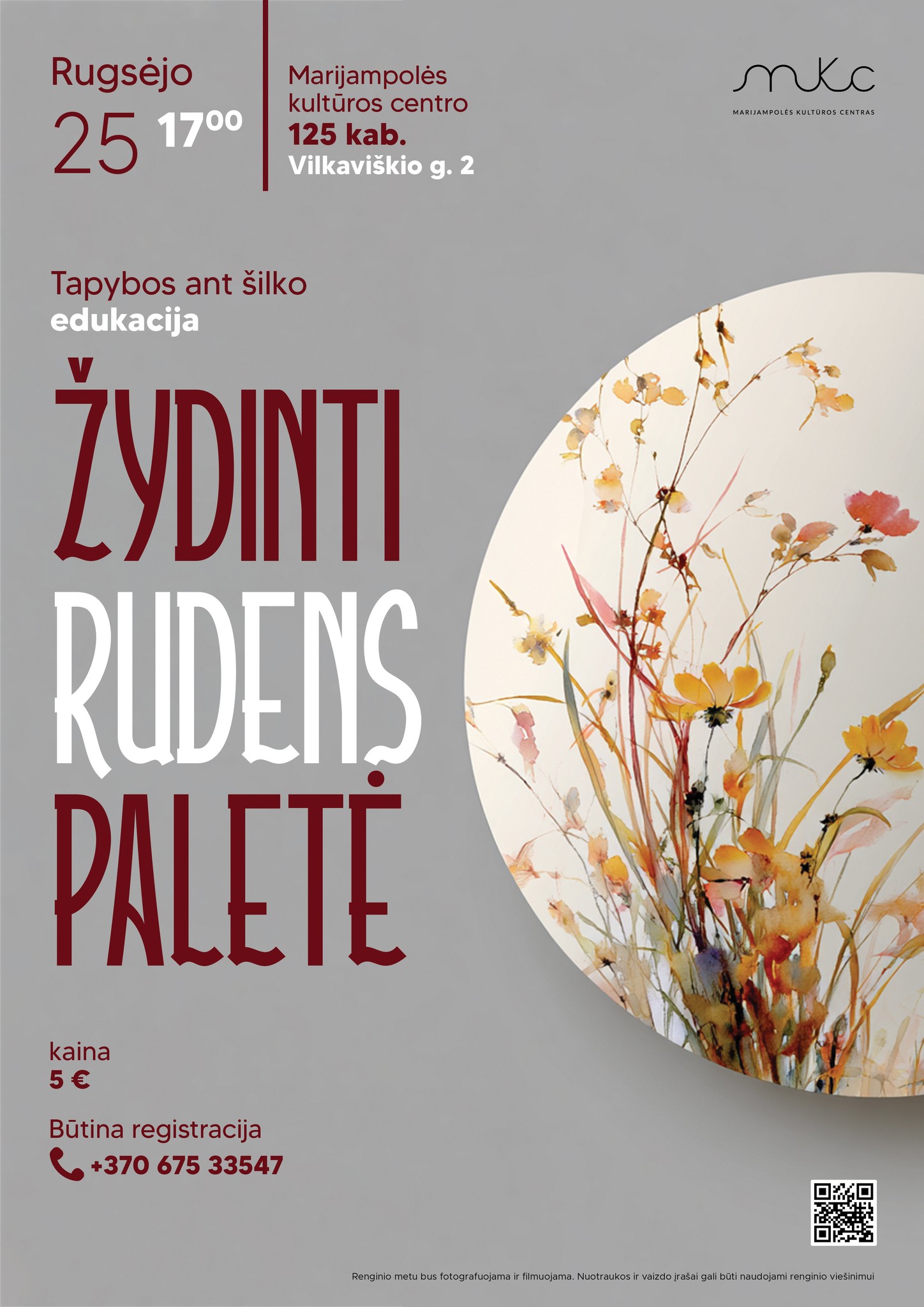 Čia, pasitelkę spalvų gausą ir rudens įkvėpimą, kursime subtilius ir unikalius piešinius ant šilko. Tai puiki proga atsipalaiduoti, atrasti naują techniką bei pasimėgauti kūrybine atmosfera.