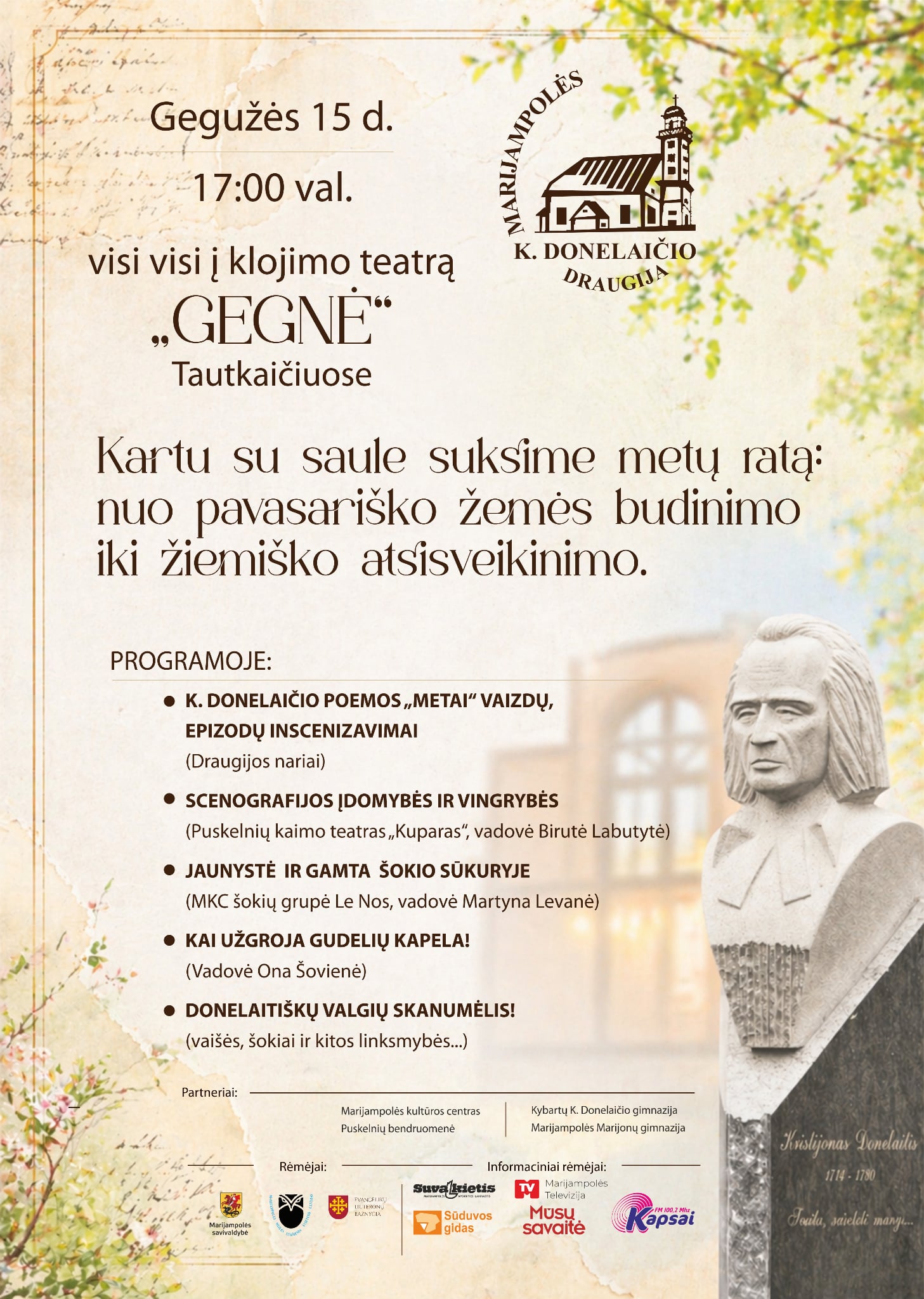Kartu su saule suksime metų ratą – nuo pavasariško žemės budinimo iki žiemiško atsisveikinimo. Tai prasmingas susitikimas su Kristijono Donelaičio kūryba, lietuviška tradicija, muzika, judesiu ir bendryste. ✨